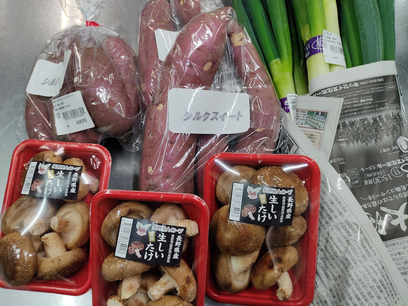天ぷら用の秋野菜を仕入れ 天ぷら用の秋野菜を求めて直売所等へ。 売り場には、大根 白菜 法蓮草といった秋冬野菜が多く並ぶようになってきました 本日の仕入れは なめらかな食感が特徴のシルクスイート 長野県産の椎茸 薬味用の長ネギ それと賄い用に里芋も